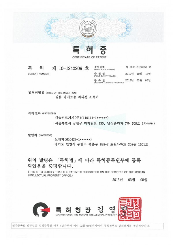 紫外线消毒器专利证书 페이지 정보 작성자 DAISEUNG 댓글 0건 조회 234회 작성일 22-04-12 15:34 목록 본문 紫外线消毒器专利证书 이전글医用吸引枪专利证书 22.04.12 다음글具有止血效果的医用支架专利证书 22.04.12 댓글 0 댓글목록 등록된 댓글이 없습니다.