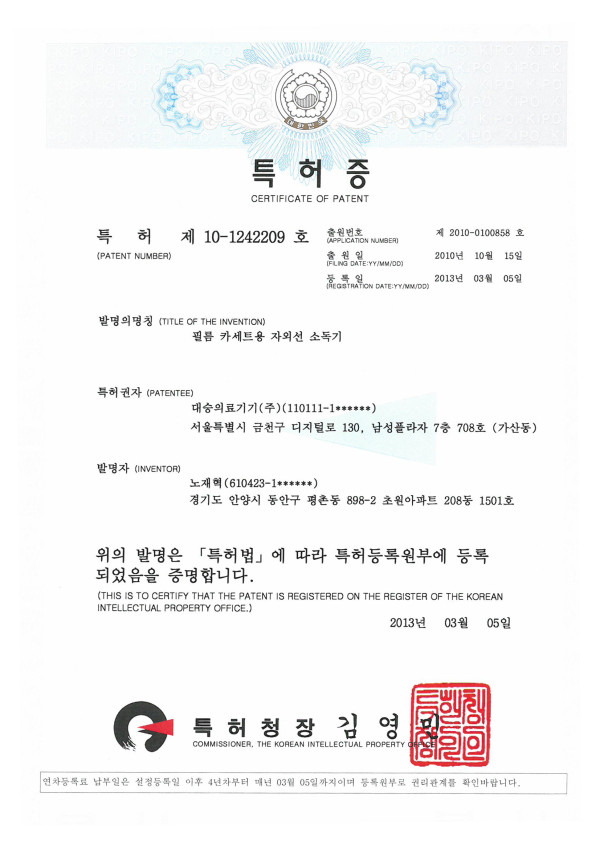 자외선소독기 특허증 페이지 정보 작성자 DAISEUNG 댓글 0건 조회 231회 작성일 22-04-12 15:34 목록 본문 자외선소독기 특허증 이전글의료용 흡입기 특허증 22.04.12 다음글지혈효과를가진 의료용 지지대 특허증 22.04.12 댓글 0 댓글목록 등록된 댓글이 없습니다.