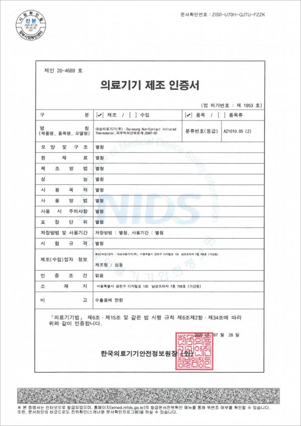 [DSNT-02] 비접촉 피부적외선 체온계 수출용 제조 인증서
